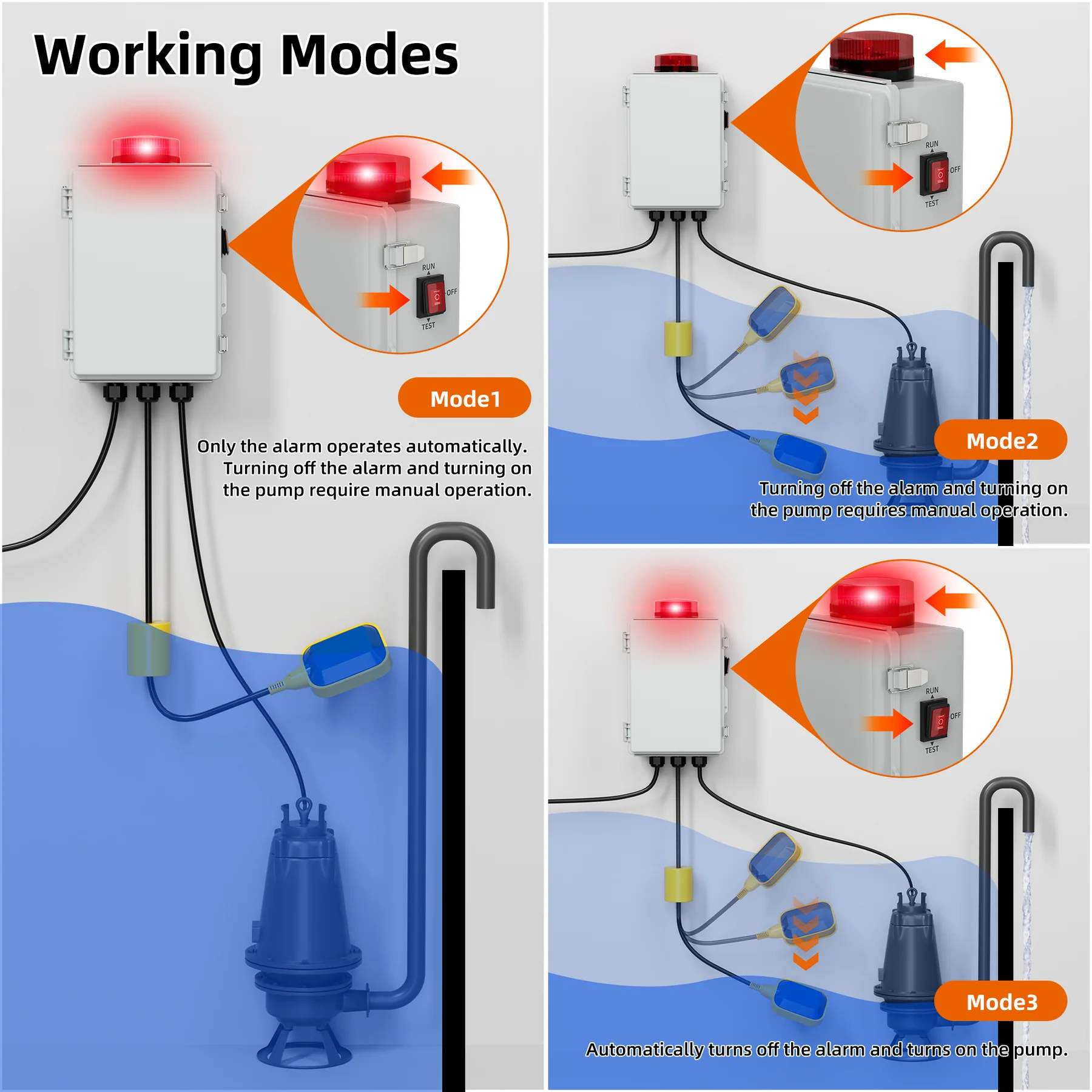 【Mångsidiga driftslägen】- Sump Pump Control System erbjuder flexibla driftslägen som passar olika behov. Läge 1 aktiverar larmet automatiskt men kräver manuell pumpdrift, eftersom bilderna detaljerar. Läge 2 kräver manuell pumpdrift för att slå på larmet och pumpen. Läge 3 styr automatiskt pumpen och slår på larmet baserat på vattennivån.