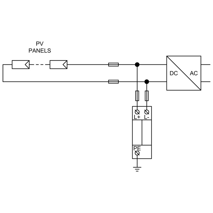 U -anslutning: Konventionell skyddstopologi för PV DC -kretsar.