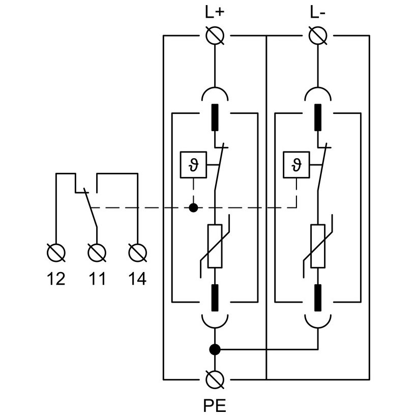 Interna termiska kopplingar på varistorvägar (L+, L-, PE)