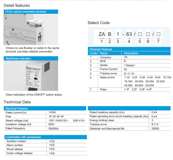 Model: ZAB1-63Brand: GREENWATTType: Miniature Circuit Breaker (MCB)Poles: 4 (Four-pole)Rated Current: 63ATripping Curve: C curveRated Voltage: 400V ACStandards: IEC60898-1 compliantBreaking Capacity: 6000AApplications: Suitable for residential, commercial, and industrial electrical distribution systemsFeatures:Provides overcurrent and short-circuit protectionHigh reliability och lång service LIFEESEASY DIN RAIL INSTALLATIONCOMPACT DESIGN för rymdbesparande i distributionsbrädor